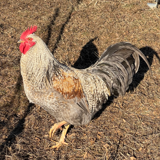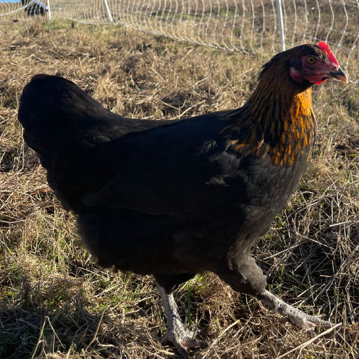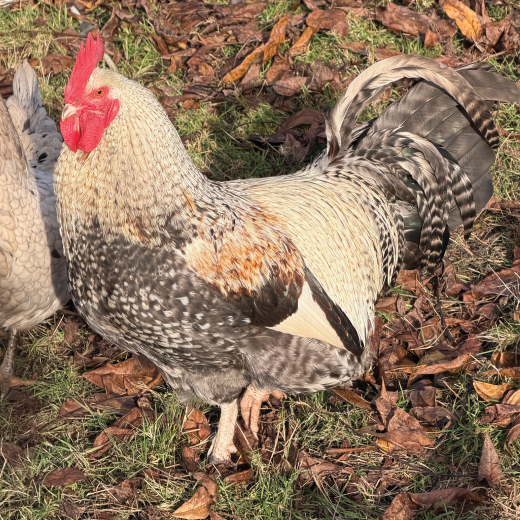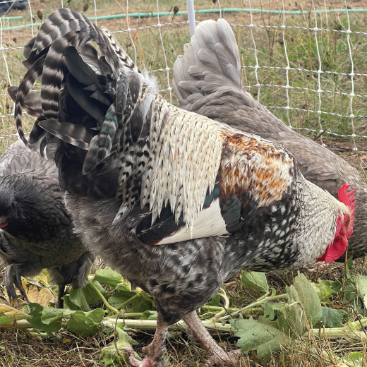 For our 2026 Main Pen breeding rooster, we liked so many of our grow-out roosters, but one in particular stood out. Black as a dominant color was not our first choice, but this gentleman always has a group of ladies around him in a very mixed flock, is always chatting to them, and almost always dances before mating. He has a similar body type to his father but a more dual purpose leaning form. On top of that, we believe he’s carrying the Silver gene (possibly two) and has spangling on his chest. A criteria for this project is some sort of pattern to help with camouflaging from aerial predators, though we have not set out with a specific pattern as the end goal.
