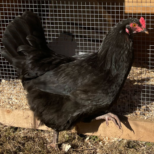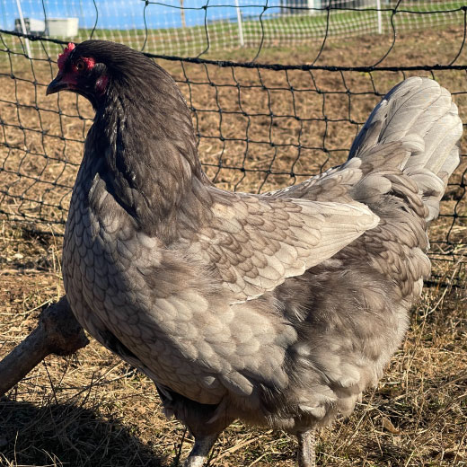 The Moss Line will come from our hens that are out of a French Black Copper Marans rooster over a blue Silverudd’s Blue hen. These hens are blue self-laced or black with faint copper or white leakage about the face. They have faintly feathered legs and are slightly larger than Silverudd’s Blue.