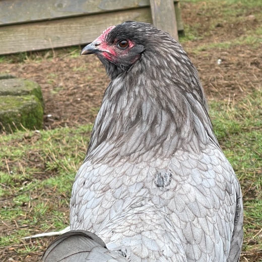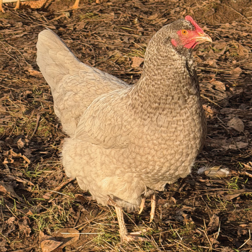 For the Lichen Line, we have only one hen, out of a Swedish Flower Hen rooster over a blue Silverudd’s Blue hen (This cross is available under Rising Mist). She is white with faint gray lacing around her neck and dilute splash markings. She started laying at 20 weeks on the dot and has quickly become a favorite.
