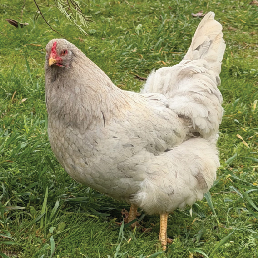 For the Lichen Line, we have only one hen, out of a Swedish Flower Hen rooster over a blue Silverudd’s Blue hen (This cross is available under Rising Mist). She is white with faint gray lacing around her neck and dilute splash markings. She started laying at 20 weeks on the dot and has quickly become a favorite.