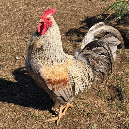 For our 2026 Main Pen breeding rooster, we liked so many of our grow-out roosters, but one in particular stood out. Black as a dominant color was not our first choice, but this gentleman always has a group of ladies around him in a very mixed flock, is always chatting to them, and almost always dances before mating. He has a similar body type to his father but a more dual purpose leaning form. On top of that, we believe he’s carrying the Silver gene (possibly two) and has what appears to be spangling on his chest. A criteria for this project is some sort of pattern to help with camouflaging from aerial predators, though we have not set out with a specific pattern as the end goal.