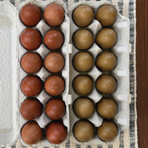 In 2024, a determined broody Silverudd’s Blue in a pen with a French Black Copper Marans rooster hatched our first Gilded Martin chicks on her own. Those chicks have turned into truly gorgeous, sizable hens laying the most unusual deep shades of olive, sometimes appearing almost mauve or a rich, earthy brown, leaving us no choice but to continue with this mix of genetics.