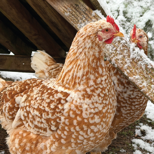In 2026, we are planning to breed both one of our original roosters from Greenfire and one of our 2025 grow-out roosters who lacks the red shoulders seen in most of our roosters from Greenfire. He is on the lighter end of the variety of shades expected from the Roxa variety that presents as mottled and is mostly golden in his hackle feathers. We have three groups of hens, one from Greenfire, one out of our darkest hued rooster, and one out of our white rooster. You may receive chicks from either or both of our roosters.