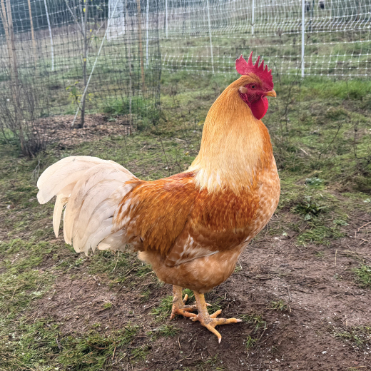 Some roosters you just can’t process. Orange Guy is the result of our white presenting Pita Pinta Asturiana Roxa rooster over a Bielefelder hen. His sister is one of our strongest layers, laying an often extra large pink egg, whereas her Bielefelder mother only laid a large egg. With a dose of Bielefelder genetics, we hope to improve on the laying ability of the Pita Pinta, as well as diversify a small gene pool. Orange Guy is calm, easy to pick up, and dedicated to his flock. When we first tried to integrate him into our bachelor flock with a group of other cockerels, he flew over the cockerel group’s fencing and, instead of running about foraging and giving chase as others do, ran right up to us and asked to be picked up. We acquiesced to this request and have always had him in a breeding pen. He is a golden buff to orange color and carries a single barring gene and a single mottling gene. Half of his chicks will be barred and half of his chicks will carry a mottling gene. We are pairing him with a group of Buckeye hens in 2026.