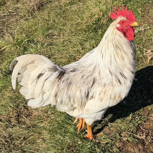 In 2026, we have selected a dilute splash Silverudd’s Blue x Swedish Flower Hen rooster, who is heterozygous for the blue egg gene (has just one gene), several of his sisters, and a group of purebred Swedish Flower Hen hens. Interestingly when using the Swedish Flower Hen as the mother, the chicks still seem to have inherited the Silverudd’s Blue’s size. The Silverudd’s Blue genetics in this group are from a small scale breeder who claims first import stock. We have two lines under Rising Mist in 2026: the Blue Line is blue egg gene oriented, and the Swedish Line is mottling oriented.